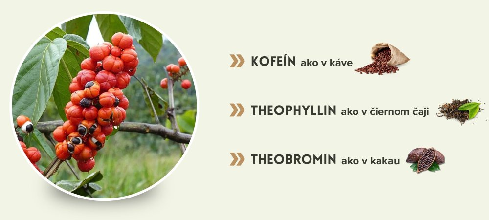 Guarana obsahuje rovno 3 stimulační látky – kofeín (podobná káva), theofylin (podobný čiernemu čaju) a theobromin (podobný kakau). Je kromě toho aj bohatým zdrojom antioxidantov. zvýšit vytrvalosť, zlepšit pozornost a soustředění.