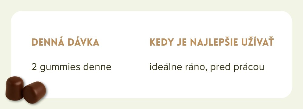Stačí si dať 2 gummies denne – ideálne ráno pred začiatkom dňa. Po dokončení 1 balenia odporúčame urobiť 7-dňovú pauzu.